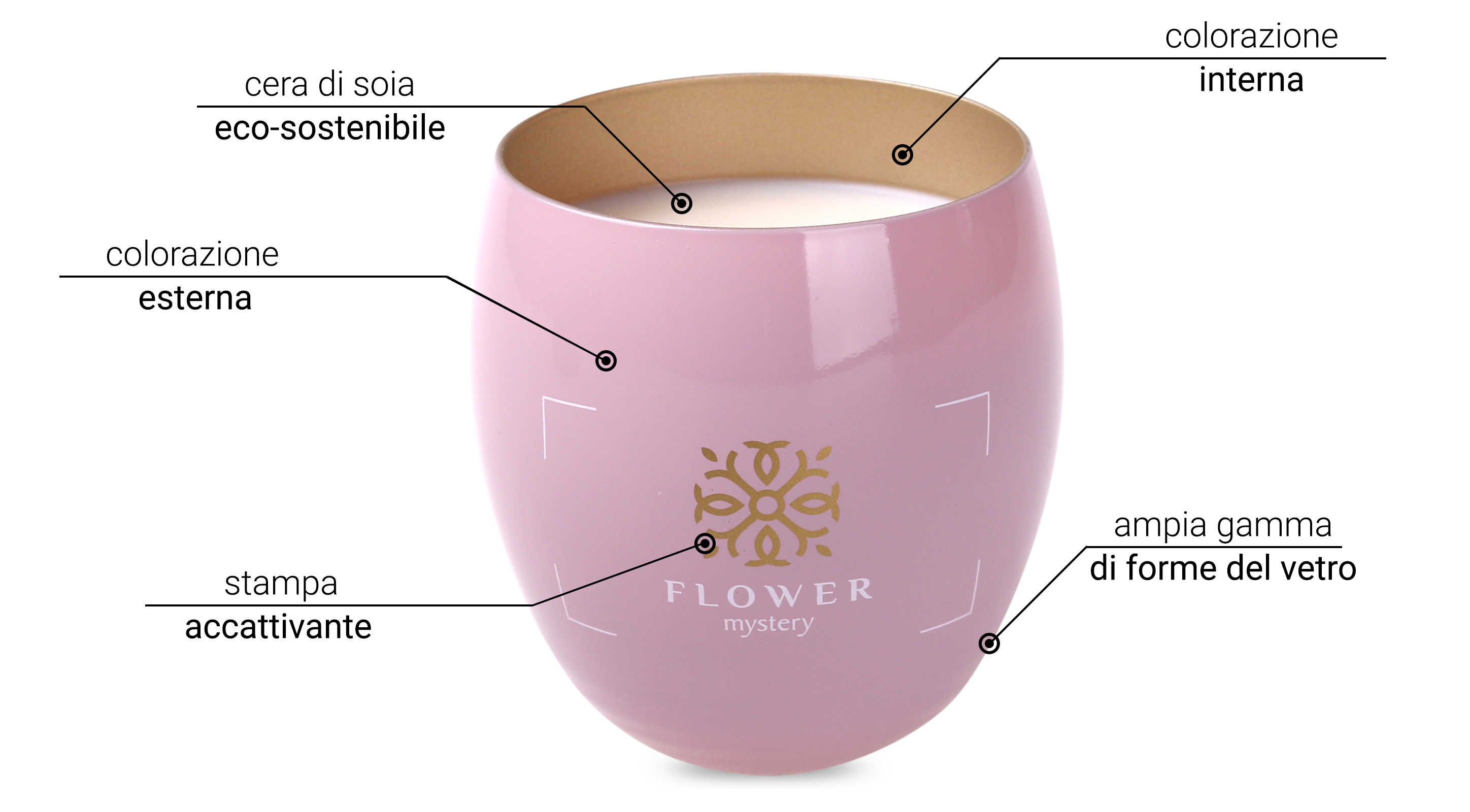 Fai risaltare il tuo brand. Scintillante Quando si entra nel mondo di Candlesphere, si hanno illimitate possibilità di distinguersi, di creare un brand e di personalizzarlo. Puoi sorprendere il tuo cliente: con un'ampia gamma di bellissime forme di vetro, la ricchezza della colorazione e delle decorazioni del vetro, il riempimento in cera di soia. Ciò che distinguerà ulteriormente il regalo sono: la personalizzazione con un aroma unico e duraturo tra tre gruppi di fragranze e, inoltre, una confezione perfettamente abbinata, che può anche essere personalizzata con il logo. |