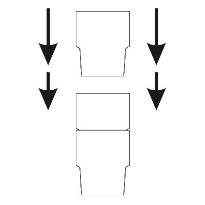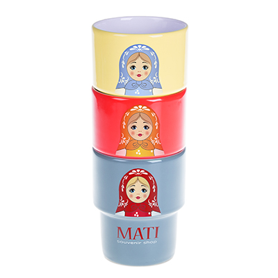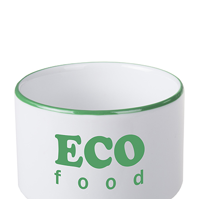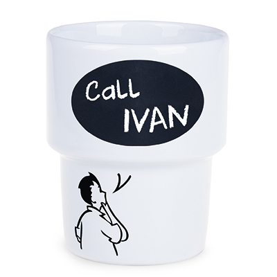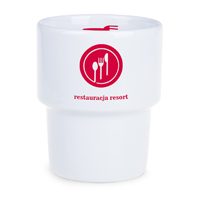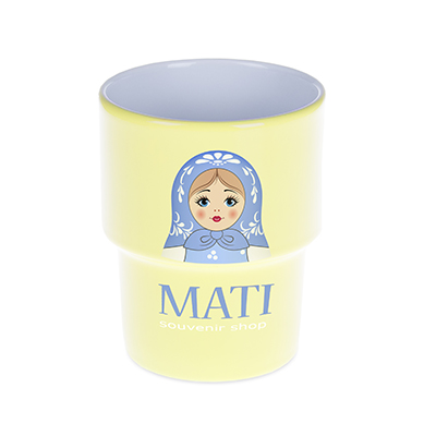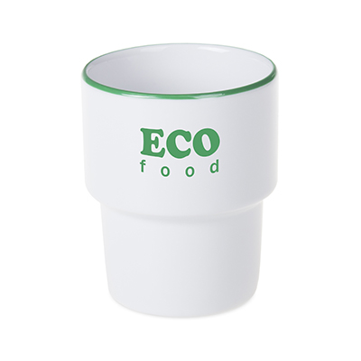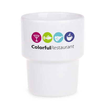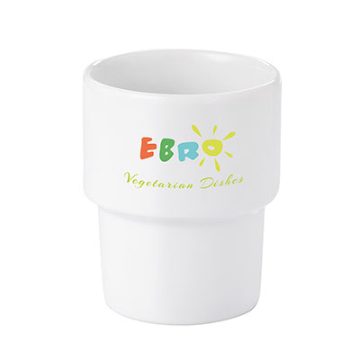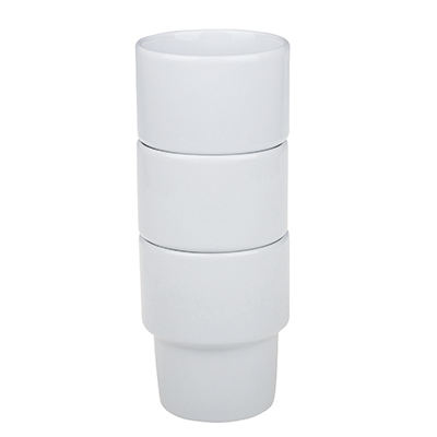 Una tazza in porcellana di medie dimensioni senza manico. Il design consente di impilarle.