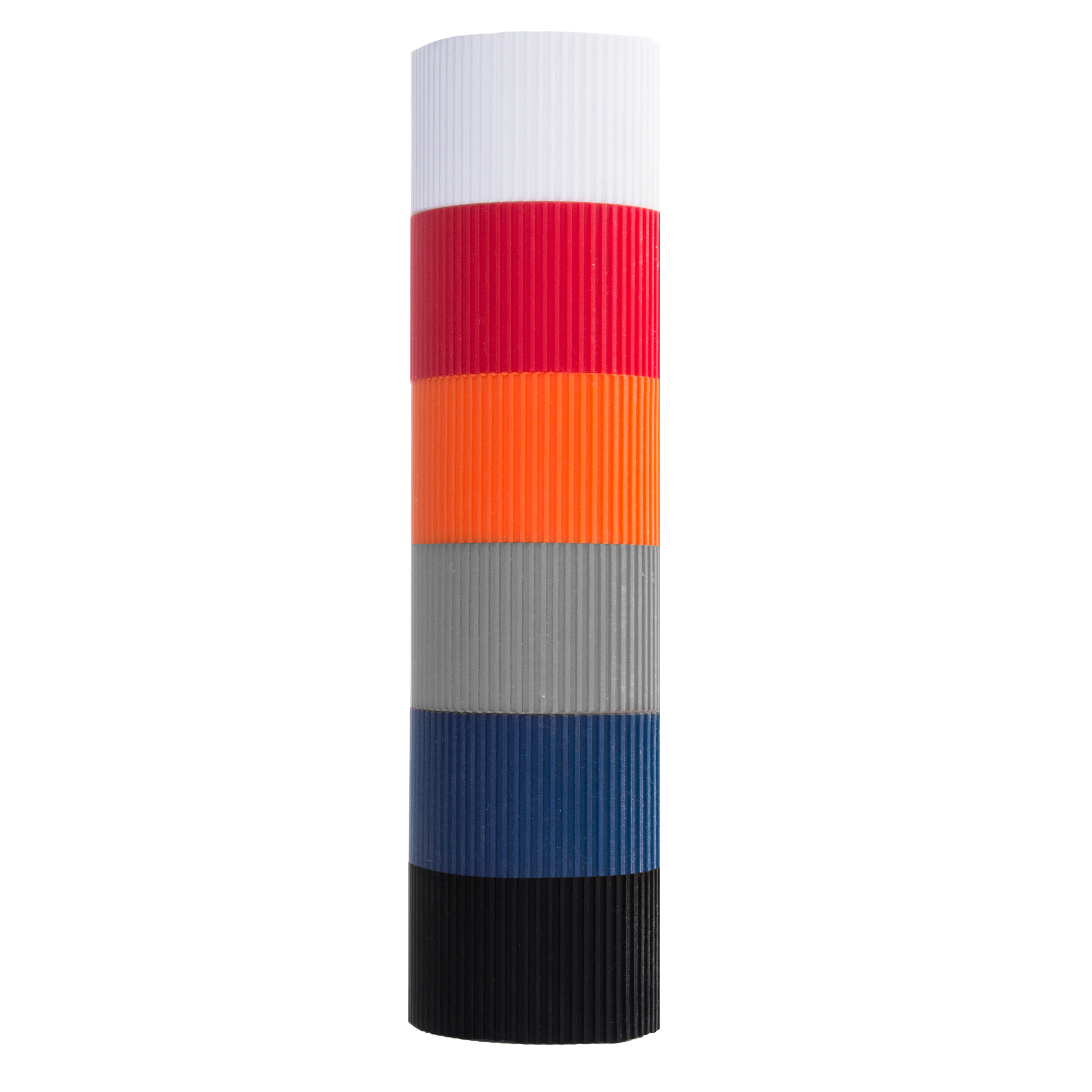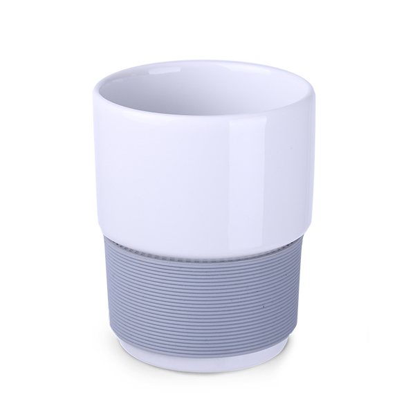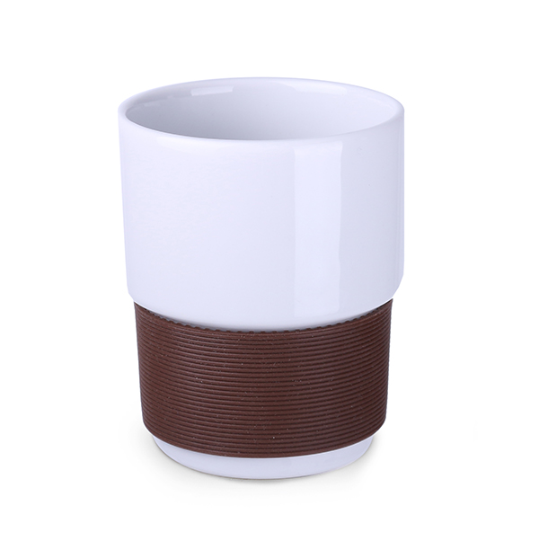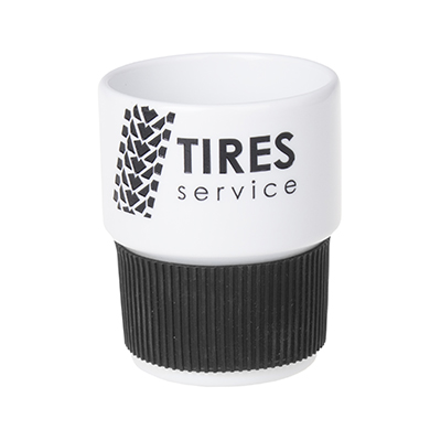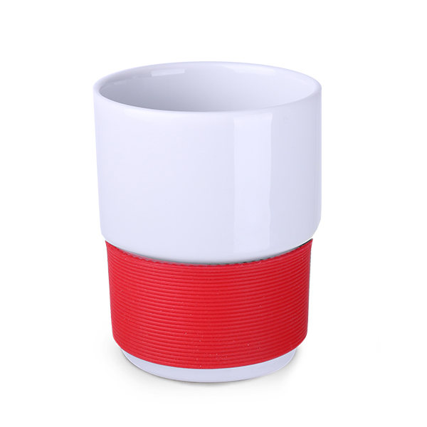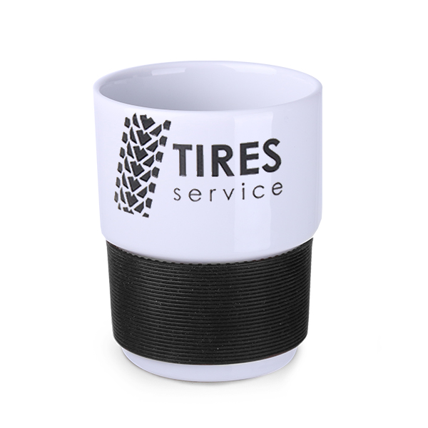Tazza promozionale di medie dimensioni in porcellana senza manico. Bande larghe 40 mm disponibili in 7 colori: bianco, arancione, rosso, verde, blu navy, marrone e nero.