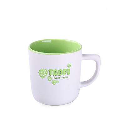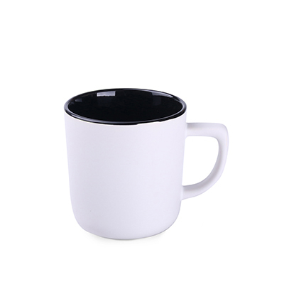 Una tazza dalla forma moderna con esterno bianco satinato e un'ampia area di stampa. L'interno lucido disponibile in quattro colori può essere il complemento dei colori del brand.