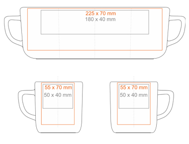 Stampa sul manico (40x10 mm) Stampa interna (60x15 mm) Stampa sul fondo interno (ø30 mm) Stampa sul fondo esterno (ø40 mm) Stampa sul bordo Stampa nominale |