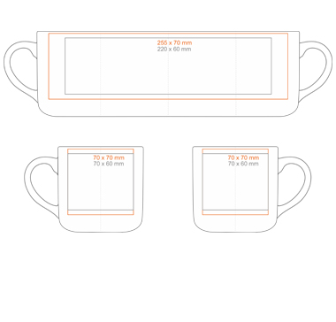 Stampa sul manico (90x10 mm) Stampa interna (50x15 mm) Stampa sul fondo interno (ø55 mm) Stampa sul fondo esterno (ø45 mm) Stampa sul bordo Colorazione del bordo con riga fatta a mano Stampa nominale |