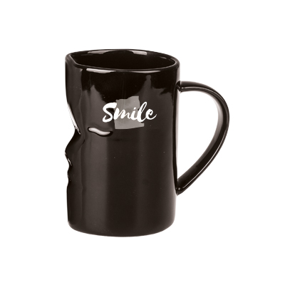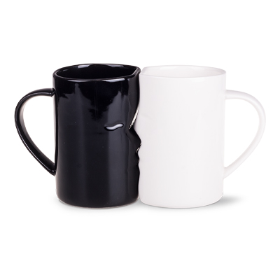 Un set di due tazze i cui bordi combaciano perfettamente a formare una faccia - la tazza bianca è in porcellana Royal, la tazza nera è in ceramica. Questo prodotto è un fine serie e potrebbe presentare fori, punti e differenze nella tonalità dello smalto.