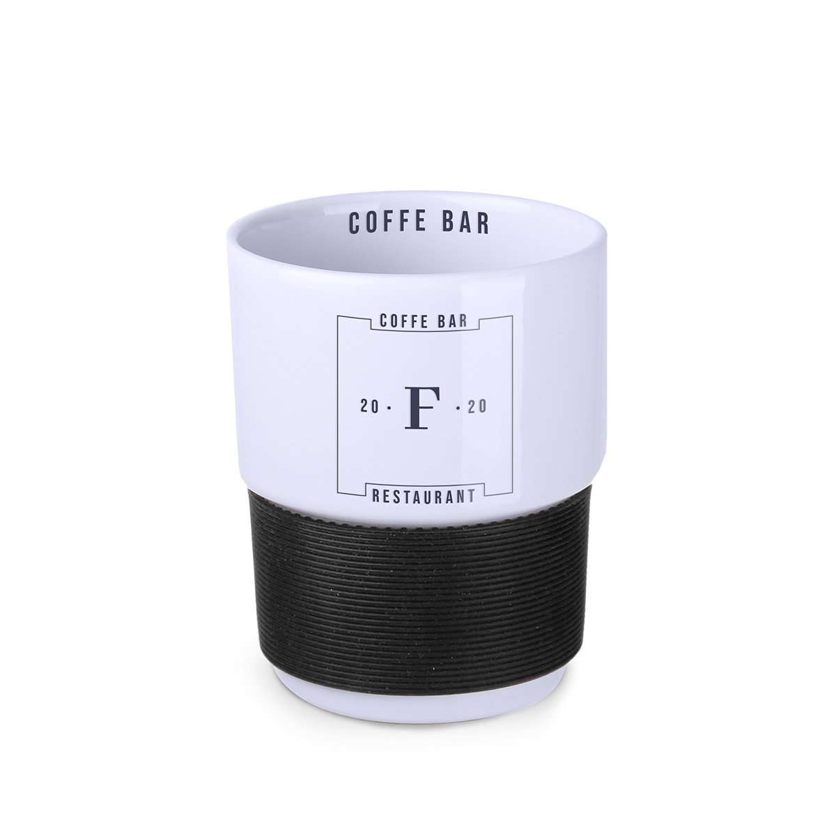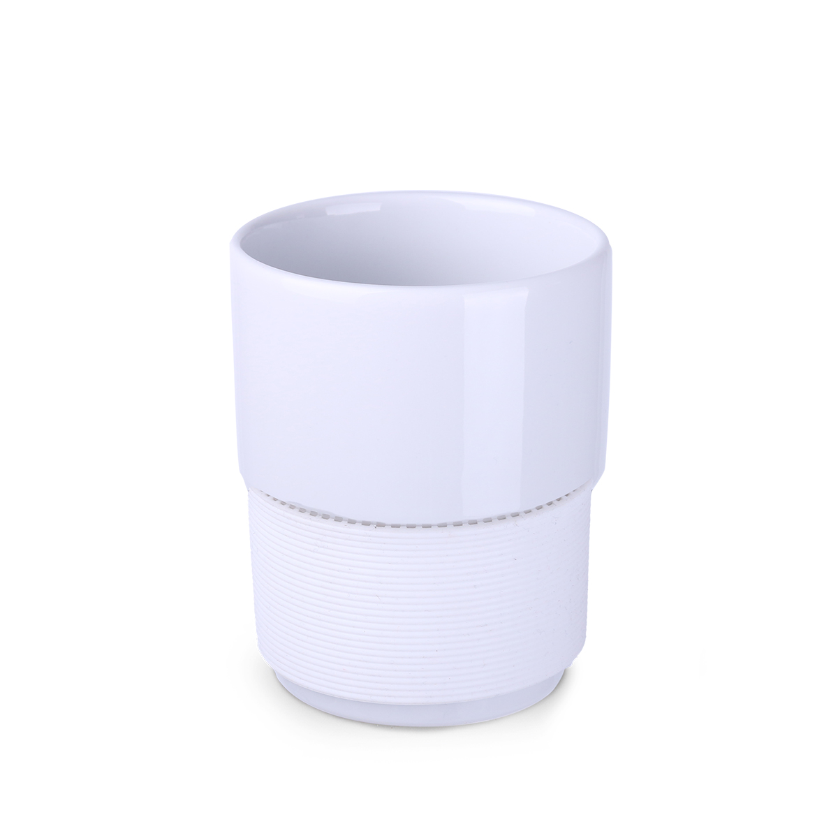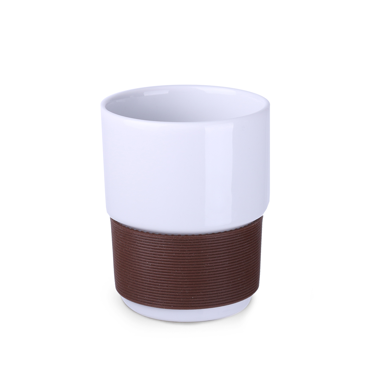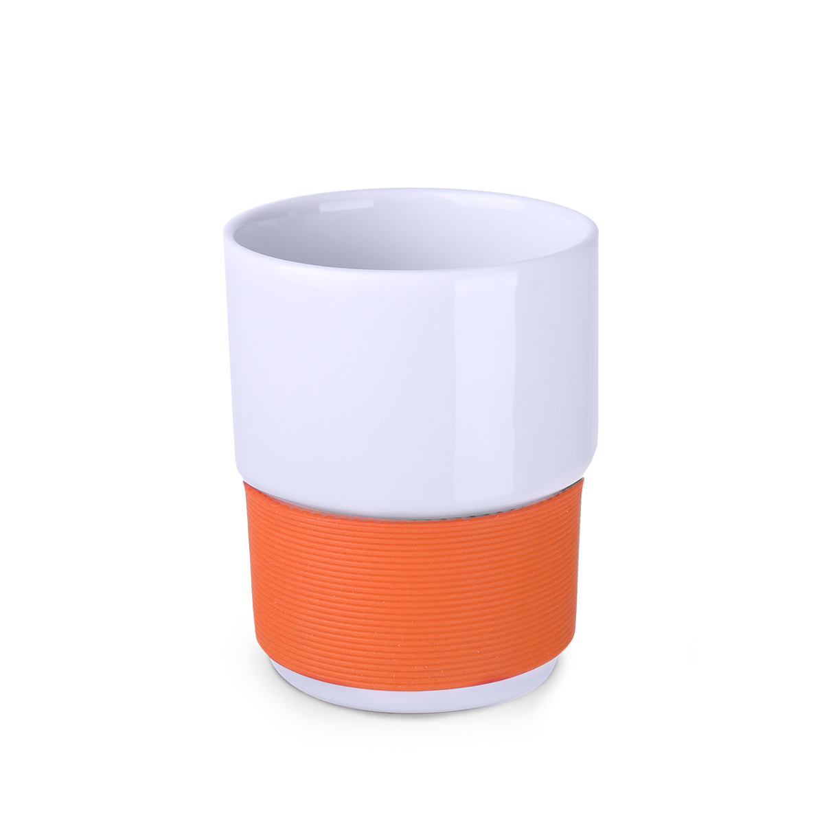 Tazza promozionale in ceramica di medie dimensioni senza manico. Bande larghe 40 mm disponibili in 7 colori: bianco, arancione, rosso, verde, blu navy, marrone e nero.