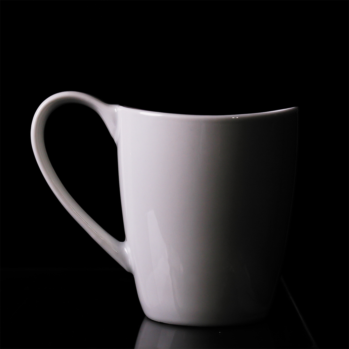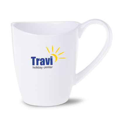 Una tazza in porcellana con un grande manico e il bordo leggermente ondulato.