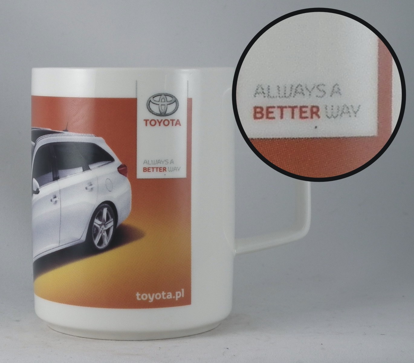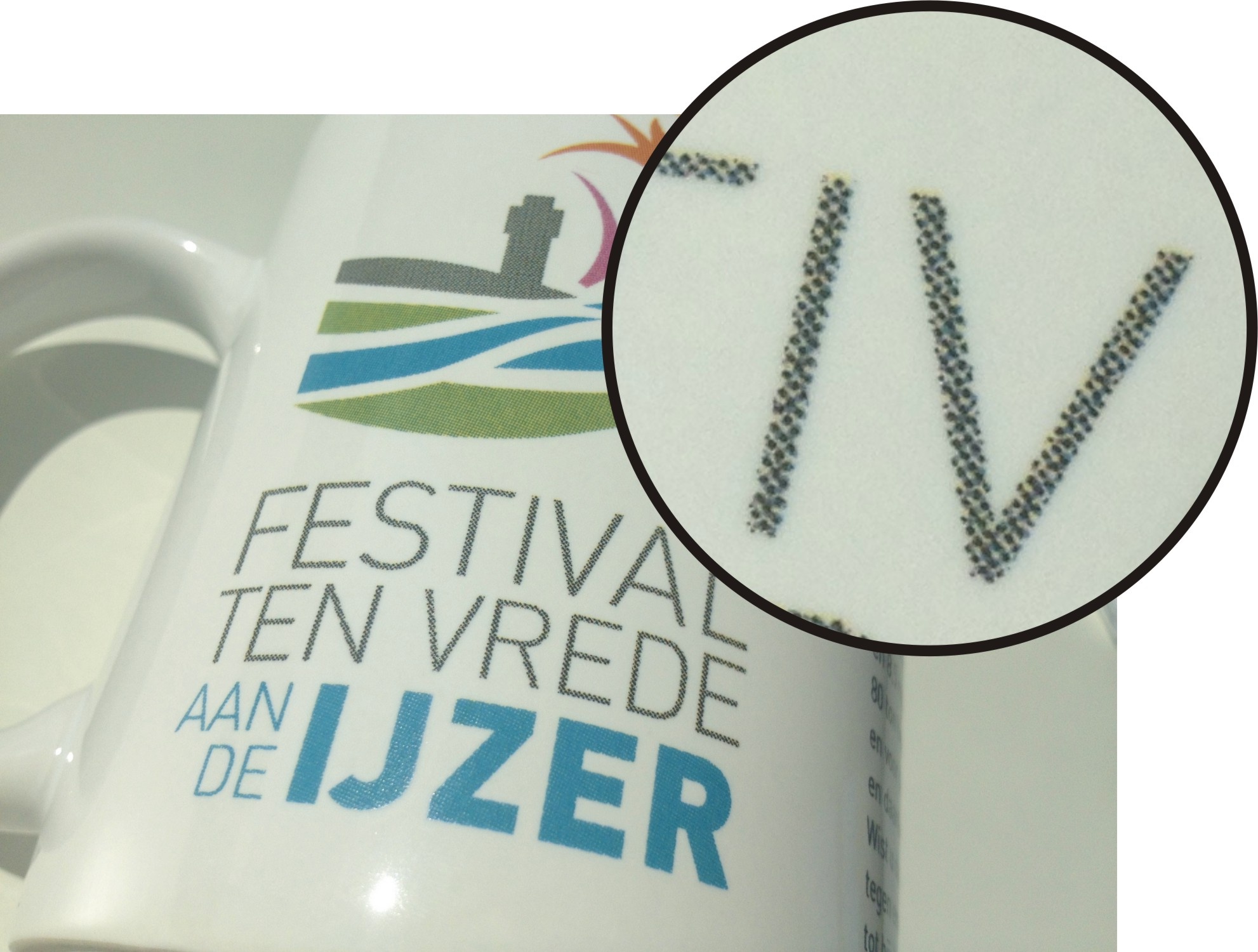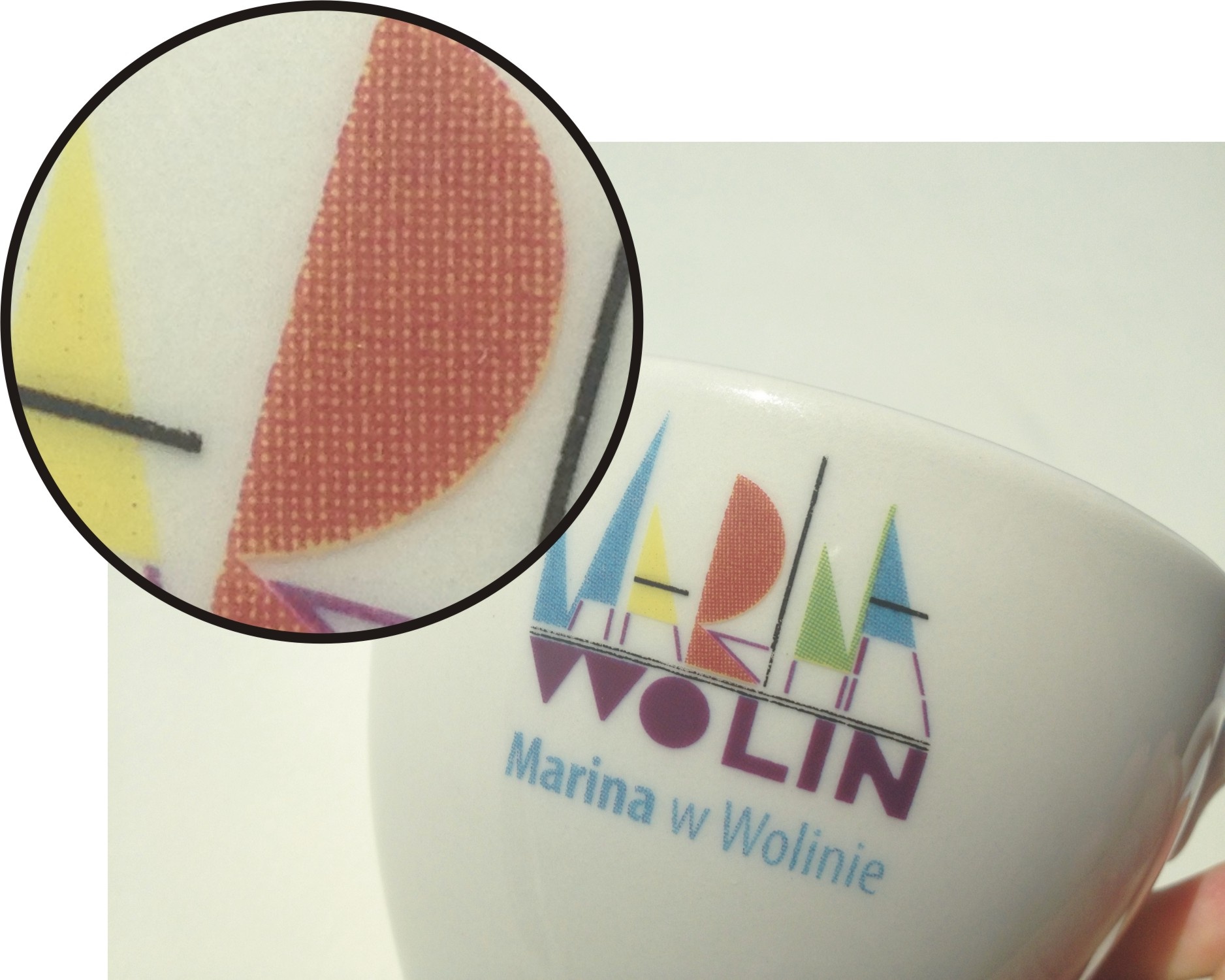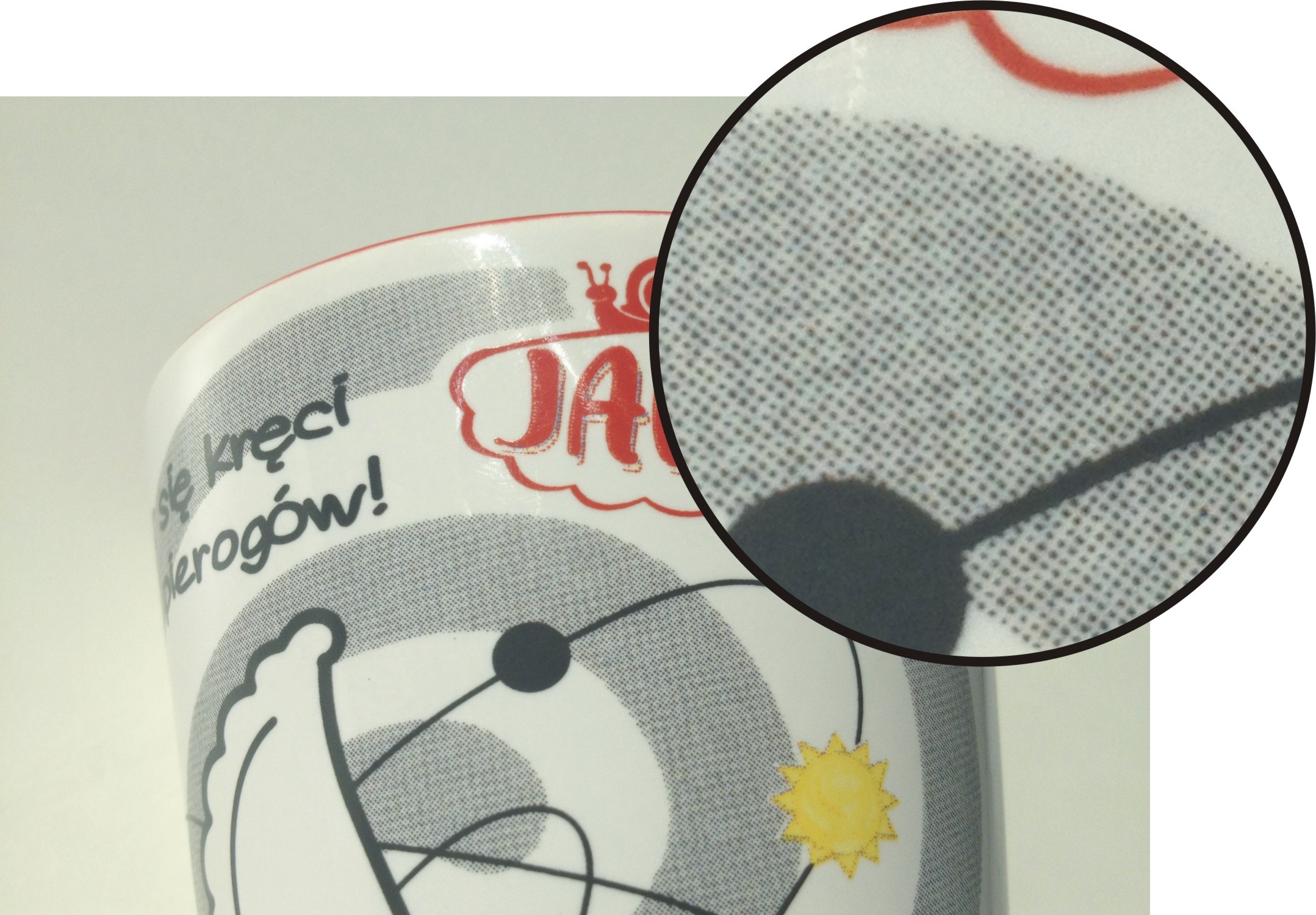 Sulle tazze con stampa in CMYK, i caratteristici puntini sono visibili (specialmente a distanza ravvicinata). Questi puntini diventano altamente visibili su grandi superfici omogenee.